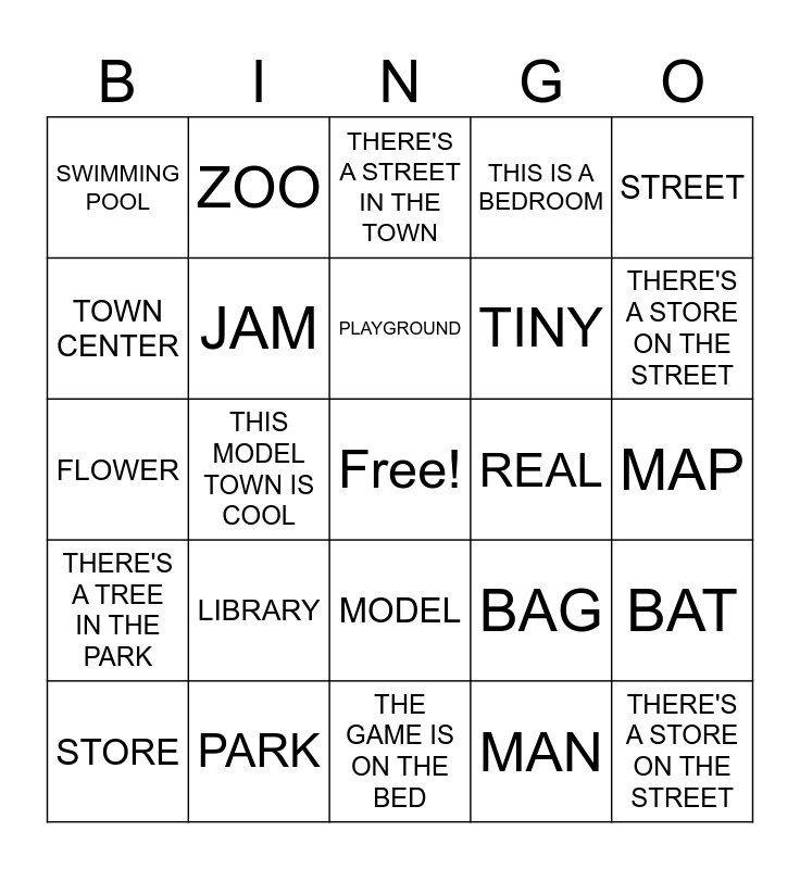This bingo card has a free space and 24 words: LIBRARY, PARK, PLAYGROUND, STORE, STREET, SWIMMING POOL, TOWN CENTER, ZOO, REAL, MODEL, TINY, FLOWER, BAG, BAT, JAM, MAN, MAP, THERE'S A STREET IN THE TOWN, THERE'S A STORE ON THE STREET, THIS MODEL TOWN IS COOL, THERE'S A STORE ON THE STREET, THERE'S A TREE IN THE PARK, THIS IS A BEDROOM and THE GAME IS ON THE BED.