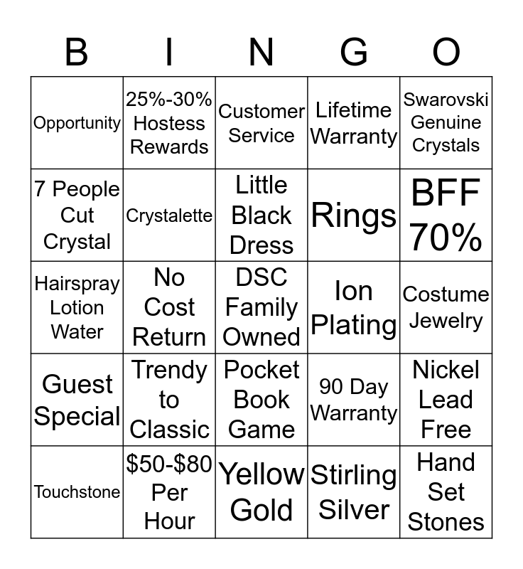 This bingo card has 25 words: Trendy to Classic, Yellow Gold, Little Black Dress, Touchstone, Swarovski Genuine Crystals, Opportunity, 7 People Cut Crystal, 25%-30% Hostess Rewards, Ion Plating, Pocket Book Game, Rings, Hairspray Lotion Water, 90 Day Warranty, Nickel Lead Free, Crystalette, Hand Set Stones, Costume Jewelry, Customer Service, BFF 70%, No Cost Return, DSC Family Owned, $50-$80 Per Hour, Guest Special, Lifetime Warranty and Stirling Silver.