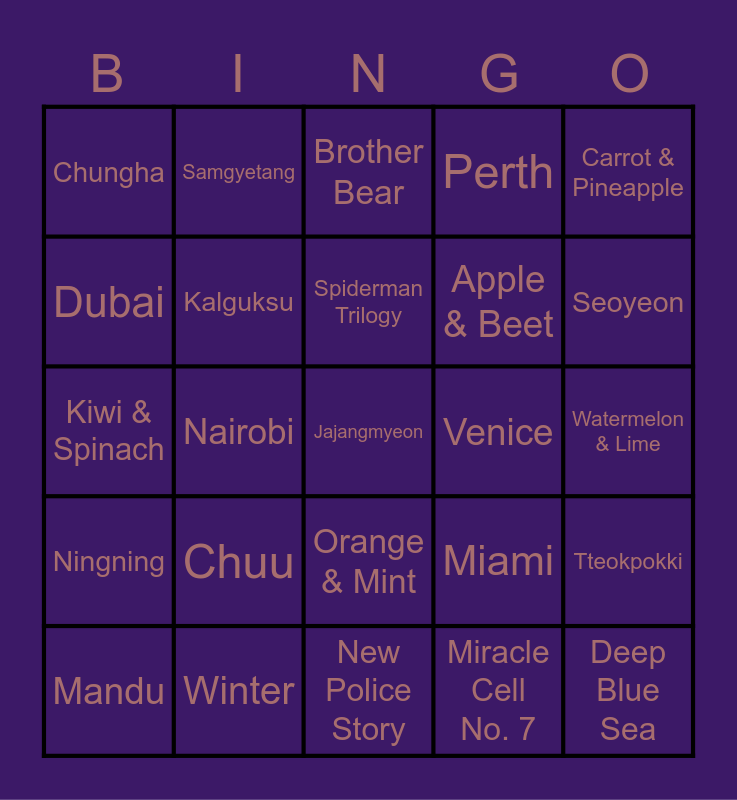 This bingo card has 25 words: Chuu, New Police Story, Spiderman Trilogy, Mandu, Carrot & Pineapple, Chungha, Dubai, Samgyetang, Venice, Orange & Mint, Apple & Beet, Kiwi & Spinach, Miami, Tteokpokki, Kalguksu, Deep Blue Sea, Watermelon & Lime, Brother Bear, Seoyeon, Nairobi, Jajangmyeon, Winter, Ningning, Perth and Miracle Cell No. 7.