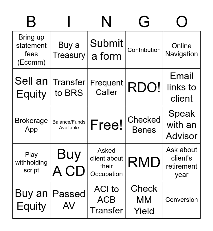 This bingo card has a free space and 24 words: Buy A CD, Passed AV, Frequent Caller, Buy an Equity, Online Navigation, Bring up statement fees (Ecomm), Sell an Equity, Buy a Treasury, Checked Benes, Asked client about their Occupation, RDO!, Brokerage App, RMD, Ask about client's retirement year, Transfer to BRS, Check MM Yield, Speak with an Advisor, Submit a form, Email links to client, Balance/Funds Available, Conversion, Play withholding script, Contribution and ACI to ACB Transfer.
