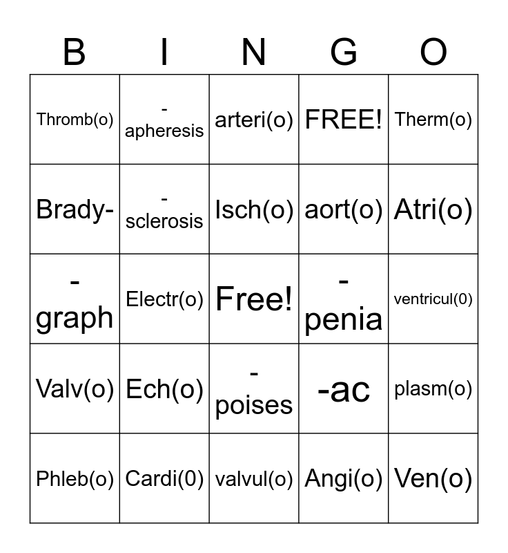 This bingo card has a free space and 24 words: Ech(o), Cardi(0), Isch(o), Phleb(o), Therm(o), Thromb(o), Brady-, -apheresis, -penia, -poises, aort(o), -graph, -ac, plasm(o), -sclerosis, Angi(o), ventricul(0), arteri(o), Atri(o), Electr(o), Ven(o), Valv(o), FREE! and valvul(o).