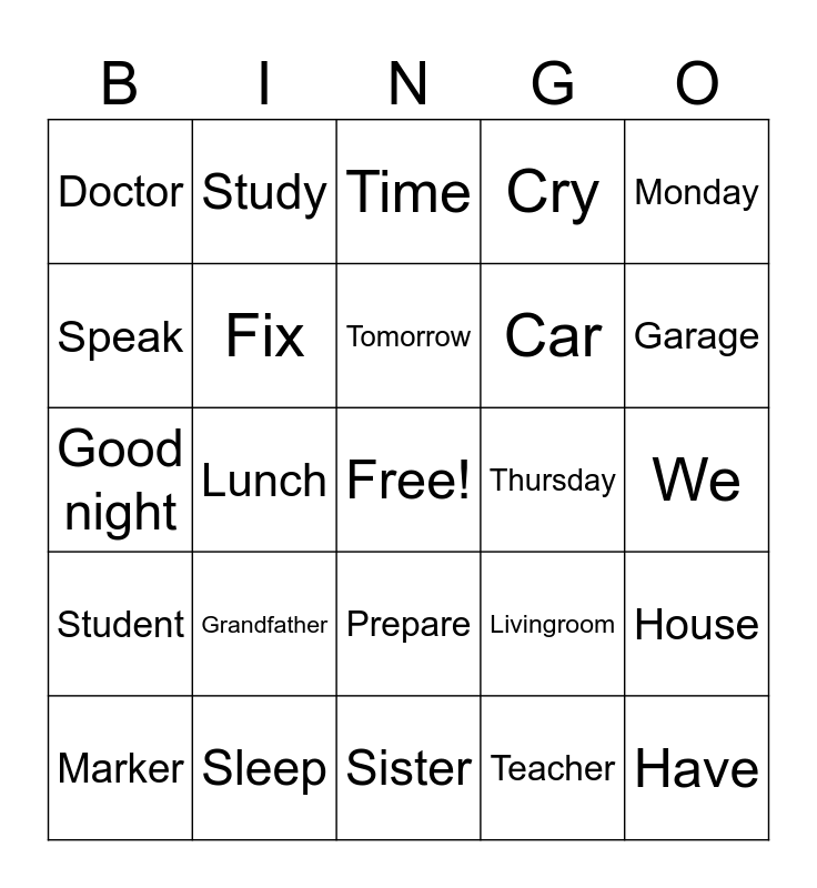 This bingo card has a free space and 49 words: Do, Have, Brother, Sister, Grandfather, Class, Study, Watch, Speak, Dance, Fix, Cry, House, Livingroom, Diningroom, Today, Tomorrow, Thursday, November, Monday, Lunch, Teacher, Doctor, Car, Books, Garage, Marker, Paper, Prepare, Student, Go, To Be, Cook, Kitchen, Sleep, Play, Try, They, We, Ruler, Eraser, Chair, Name, Good morning, Good night, Time, Sofa, Uncle and Food.