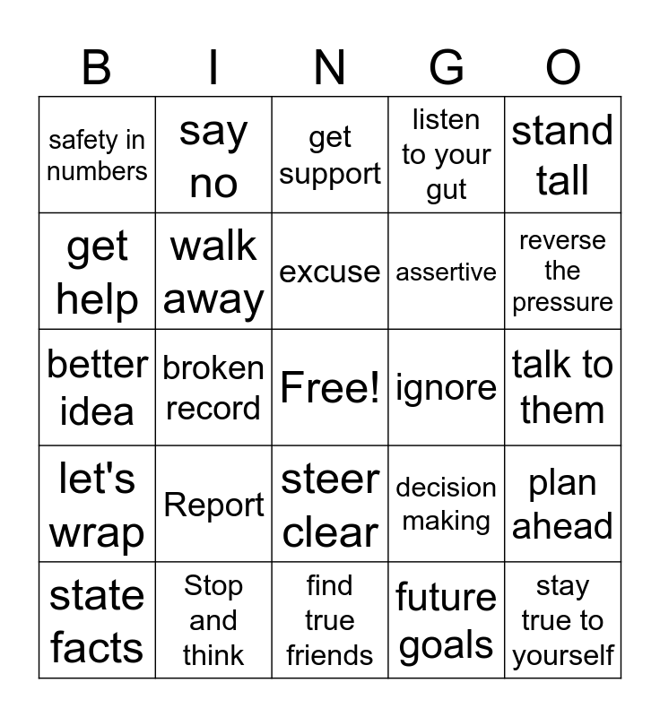This bingo card has a free space and 24 words: Report, Stop and think, excuse, state facts, stand tall, safety in numbers, get help, say no, ignore, steer clear, assertive, better idea, decision making, plan ahead, walk away, future goals, talk to them, get support, reverse the pressure, broken record, stay true to yourself, let's wrap, listen to your gut and find true friends.