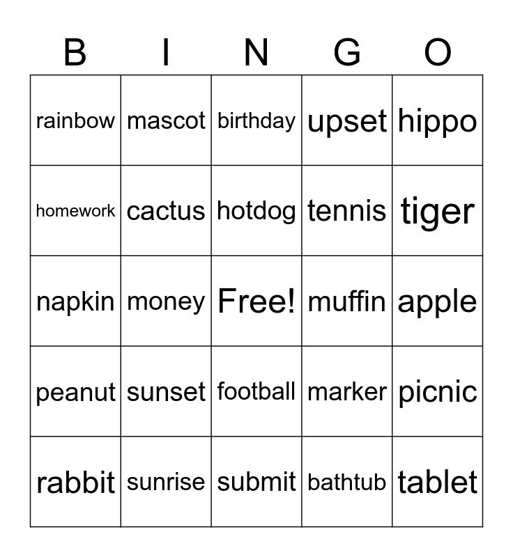 This bingo card has a free space and 24 words: sunset, sunrise, hotdog, rabbit, hippo, rainbow, homework, mascot, muffin, football, tennis, napkin, marker, picnic, cactus, bathtub, apple, birthday, tiger, money, tablet, peanut, upset and submit.