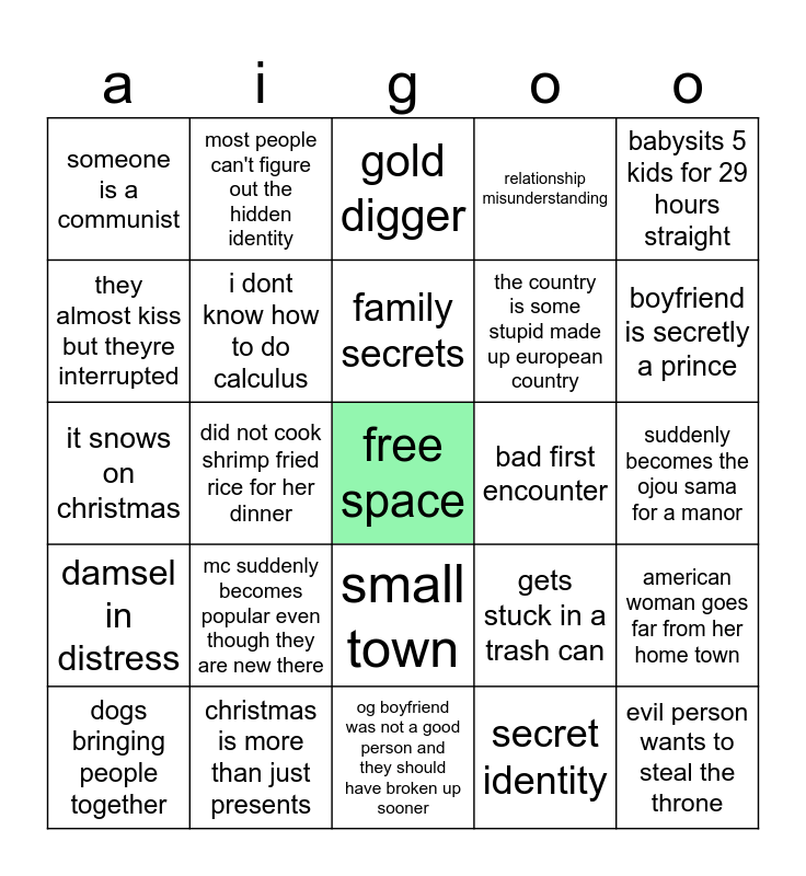This bingo card has a free space and 28 words: american woman goes far from her home town, main character is white, the country is some stupid made up european country, secret identity, they almost kiss but theyre interrupted, gold digger, most people can't figure out the hidden identity, damsel in distress, bad first encounter, dogs bringing people together, it snows on christmas, relationship misunderstanding, christmas is more than just presents, og boyfriend was not a good person and they should have broken up sooner, boyfriend is secretly a prince, i stole 50,000 dollars from your bank account, mc suddenly becomes popular even though they are new there, i dont know how to do calculus, family secrets, small town, someone is a communist, random non white side character bestie, evil person wants to steal the throne, did not cook shrimp fried rice for her dinner, suddenly becomes the ojou sama for a manor, gets stuck in a trash can, babysits 5 kids for 29 hours straight and gets cloned.