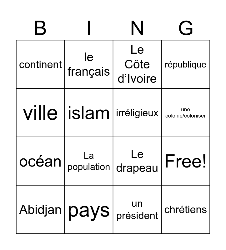 This bingo card has 20 words: Free!, Afrique, Le Côte d’Ivoire, Yamoussoukro, Abidjan, ville, pays, continent, océan, le français, La population, Le drapeau, islam, chrétiens, irréligieux, église, une colonie/coloniser, république, un président and le cacao.