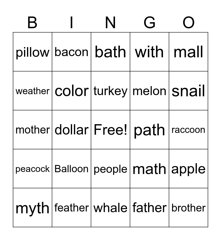 This bingo card has a free space and 24 words: Balloon, feather, turkey, myth, mall, pillow, weather, bacon, path, people, melon, mother, math, apple, color, father, raccoon, bath, snail, dollar, brother, peacock, with and whale.