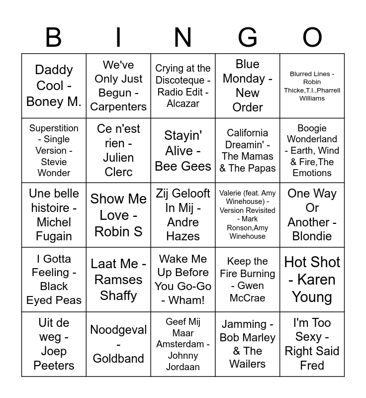 This bingo card has 52 words: Mien waar is m'n feestneus - Toon Hermans, Zij Gelooft In Mij - Andre Hazes, Saturday Night - Herman Brood & His Wild Romance, Geef Mij Maar Amsterdam - Johnny Jordaan, Laat Me - Ramses Shaffy, Sterrenstof - De Jeugd Van Tegenwoordig, We've Only Just Begun - Carpenters, Everywhere - Fleetwood Mac, Superstition - Single Version - Stevie Wonder, Non non rien n'a changé - Les Poppys, Ce n'est rien - Julien Clerc, (I Can't Get No) Satisfaction - Mono Version - The Rolling Stones, Hot Shot - Karen Young, Keep the Fire Burning - Gwen McCrae, I'm Every Woman - Chaka Khan, We Are Family - Sister Sledge, Stayin' Alive - Bee Gees, Valerie (feat. Amy Winehouse) - Version Revisited - Mark Ronson,Amy Winehouse, Rapper's Delight - The Sugarhill Gang, Blurred Lines - Robin Thicke,T.I.,Pharrell Williams, Show Me Love - Robin S, Jamming - Bob Marley & The Wailers, Daddy Cool - Boney M., California Dreamin' - The Mamas & The Papas, That's the Way (I Like It) - 2004 Remaster - KC & The Sunshine Band, I'm Too Sexy - Right Said Fred, Never, Never Gonna Give Ya Up - Barry White, Sing It Back - Moloko, Boogie Wonderland - Earth, Wind & Fire,The Emotions, Shout - The Trammps, Lost In Music - Sister Sledge, Blue Monday - New Order, Gimme! Gimme! Gimme! (A Man After Midnight) - ABBA, Toxic - Britney Spears, Alors on danse - Radio Edit - Stromae, Crying at the Discoteque - Radio Edit - Alcazar, Noodgeval - Goldband, Gold Digger - Kanye West,Jamie Foxx, Uptown Funk (feat. Bruno Mars) - Mark Ronson,Bruno Mars, Uptown Girl - Billy Joel, Wannabe - Spice Girls, One Way Or Another - Blondie, I Gotta Feeling - Black Eyed Peas, Hips Don't Lie (feat. Wyclef Jean) - Shakira,Wyclef Jean, Wake Me Up Before You Go-Go - Wham!, Lose Yourself - Eminem, De Woonboot - Stef Ekkel, Une belle histoire - Michel Fugain, Indische Waterlelies - Efteling,De Indische Waterlelies, I'm So Excited - The Pointer Sisters, Uit de weg - Joep Peeters and An der schonen blauen Donau - Johann Strauss.
