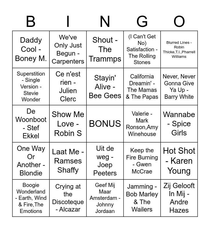 This bingo card has a free space and 51 words: Mien waar is m'n feestneus - Toon Hermans, Zij Gelooft In Mij - Andre Hazes, Saturday Night - Herman Brood & His Wild Romance, Geef Mij Maar Amsterdam - Johnny Jordaan, Laat Me - Ramses Shaffy, Sterrenstof - De Jeugd Van Tegenwoordig, We've Only Just Begun - Carpenters, Everywhere - Fleetwood Mac, Superstition - Single Version - Stevie Wonder, Non non rien n'a changé - Les Poppys, Ce n'est rien - Julien Clerc, (I Can't Get No) Satisfaction - The Rolling Stones, Hot Shot - Karen Young, Keep the Fire Burning - Gwen McCrae, I'm Every Woman - Chaka Khan, We Are Family - Sister Sledge, Stayin' Alive - Bee Gees, Valerie - Mark Ronson,Amy Winehouse, Rapper's Delight - The Sugarhill Gang, Blurred Lines - Robin Thicke,T.I.,Pharrell Williams, Show Me Love - Robin S, Jamming - Bob Marley & The Wailers, Daddy Cool - Boney M., California Dreamin' - The Mamas & The Papas, That's the Way (I Like It) - KC & The Sunshine Band, I'm Too Sexy - Right Said Fred, Never, Never Gonna Give Ya Up - Barry White, Sing It Back - Moloko, Boogie Wonderland - Earth, Wind & Fire,The Emotions, Shout - The Trammps, Lost In Music - Sister Sledge, Blue Monday - New Order, Gimme! Gimme! Gimme! (A Man After Midnight) - ABBA, Toxic - Britney Spears, Alors on danse - Stromae, Crying at the Discoteque - Alcazar, Noodgeval - Goldband, Gold Digger - Kanye West,Jamie Foxx, Uptown Funk - Mark Ronson,Bruno Mars, Uptown Girl - Billy Joel, Wannabe - Spice Girls, One Way Or Another - Blondie, I Gotta Feeling - Black Eyed Peas, Hips Don't Lie - Shakira,Wyclef Jean, Wake Me Up Before You Go-Go - Wham!, Lose Yourself - Eminem, De Woonboot - Stef Ekkel, Une belle histoire - Michel Fugain, I'm So Excited - The Pointer Sisters, Uit de weg - Joep Peeters and An der schonen blauen Donau - Johann Strauss.
