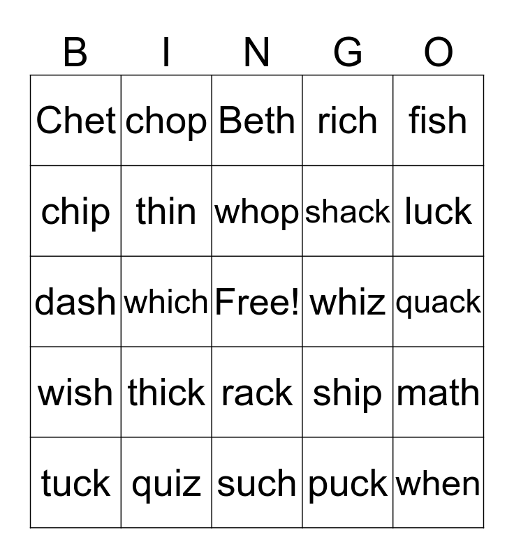 This bingo card has a free space and 29 words: tuck, bath, which, chap, Chet, Beth, thin, thick, whiz, quiz, quack, when, such, puck, luck, rock, rack, wish, fish, dash, ship, shed, shack, chip, rich, chop, math, whop and tax.