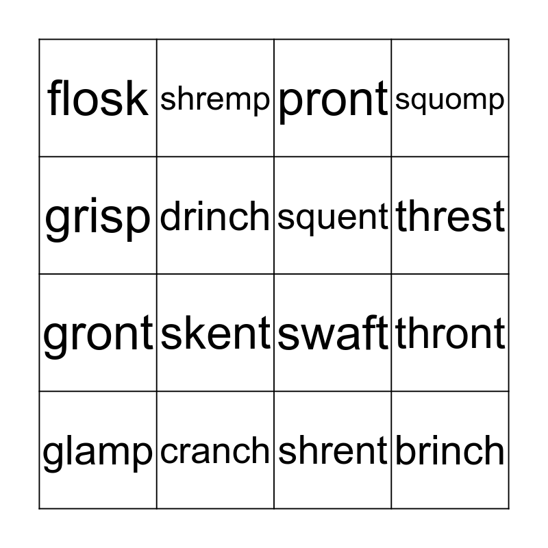 This bingo card has 23 words: brinch, crops, threst, gremp, grisp, flosk, drinch, shremp, glamp, bresk, skent, gront, shrend, thropt, cranch, pramp, pront, swaft, squent, thront, squomp, shrent and thrasp.