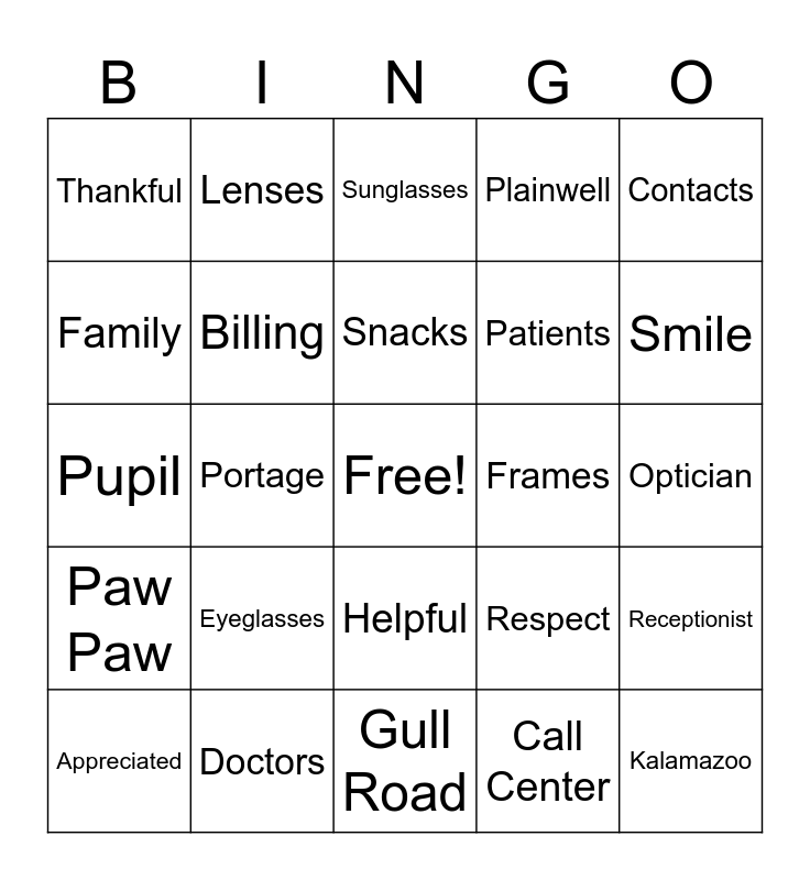 This bingo card has a free space and 24 words: Eyeglasses, Doctors, Snacks, Appreciated, Contacts, Thankful, Family, Lenses, Frames, Helpful, Patients, Pupil, Respect, Receptionist, Billing, Call Center, Optician, Sunglasses, Smile, Portage, Kalamazoo, Paw Paw, Plainwell and Gull Road.