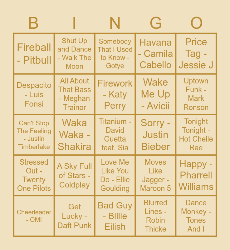 This bingo card has 28 words: Happy - Pharrell Williams, Shape Of You - Ed Sheeran, Wake Me Up - Avicii, Blurred Lines - Robin Thicke, Despacito - Luis Fonsi, Somebody That I Used to Know - Gotye, Shut Up and Dance - Walk The Moon, Stressed Out - Twenty One Pilots, Sorry - Justin Bieber, Cheerleader - OMI, Can't Stop The Feeling - Justin Timberlake, Havana - Camila Cabello, Get Lucky - Daft Punk, Bad Guy - Billie Eilish, Uptown Funk - Mark Ronson, Rather Be - Clean Bandit, A Sky Full of Stars - Coldplay, All About That Bass - Meghan Trainor, Firework - Katy Perry, Love Me Like You Do - Ellie Goulding, Fireball - Pitbull, Dance Monkey - Tones And I, Titanium - David Guetta feat. Sia, Waka Waka - Shakira, Tonight Tonight - Hot Chelle Rae, Moves Like Jagger - Maroon 5, Price Tag - Jessie J and Gangnam Style - Psy.