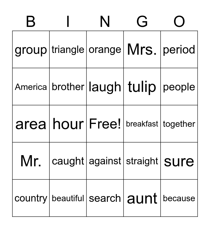 This bingo card has a free space and 24 words: caught, beautiful, laugh, country, period, group, America, triangle, breakfast, against, tulip, area, straight, sure, brother, aunt, together, orange, people, hour, because, Mr., Mrs. and search.