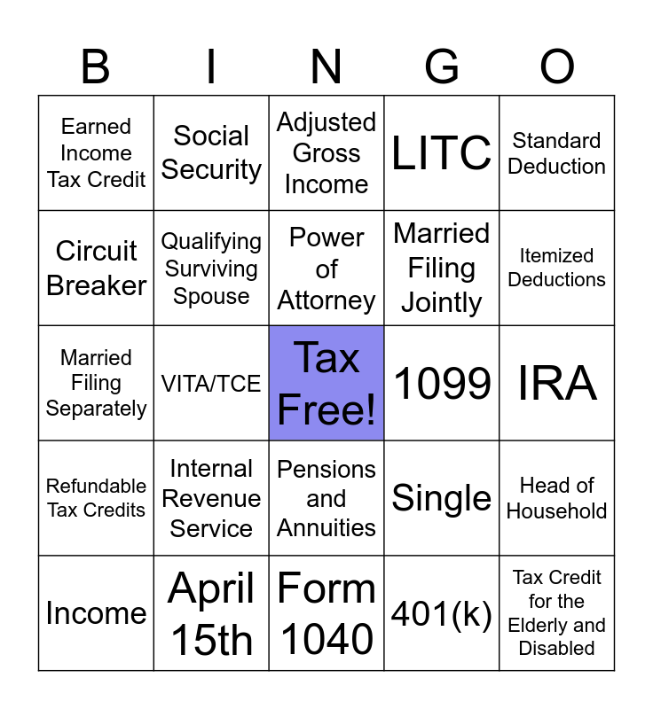 This bingo card has a free space and 24 words: Internal Revenue Service, April 15th, Power of Attorney, Income, Standard Deduction, Earned Income Tax Credit, Circuit Breaker, Social Security, 1099, Pensions and Annuities, Married Filing Jointly, Married Filing Separately, Single, Head of Household, Qualifying Surviving Spouse, 401(k), IRA, Adjusted Gross Income, Itemized Deductions, VITA/TCE, Tax Credit for the Elderly and Disabled, Refundable Tax Credits, LITC and Form 1040.