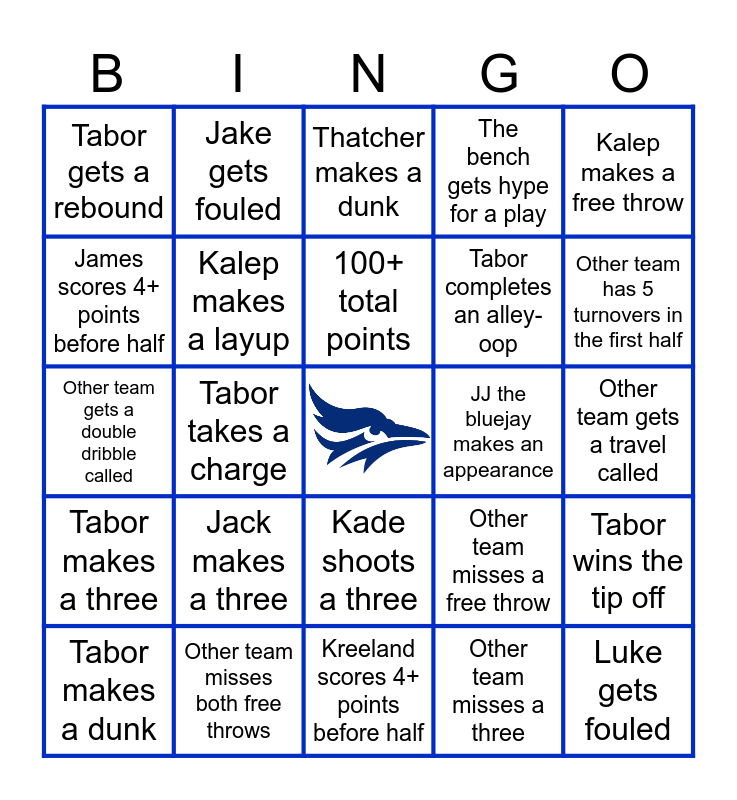 This bingo card has a free space and 38 words: Zach scores, Kenyon blocks a shot, A shot clock violation is called, Kalep makes a layup, Tabor wins the tip off, Jack makes a three, 100+ total points, Coach Warren has his arms crossed, Kalep makes a free throw, Tabor completes an alley-oop, Tabor takes a charge, The bench gets hype for a play, Luke gets fouled, Other team gets a travel called, James scores 4+ points before half, Tabor makes a three, Luke shoots a three, Thatcher makes a dunk, Tabor completes an alley-oop, JJ the bluejay makes an appearance, Tabor gets a rebound, Other team misses both free throws, Other team has 5 turnovers in the first half, Tabor makes a dunk, Kenyon makes a dunk, Kreeland scores 4+ points before half, Someone gets a technical, Kenyon gets fouled, Tabor completes an “And 1”, Tabor has two steals in the first half, A jump ball is called, Kade shoots a three, Other team misses a three, Jake gets fouled, Other team has 7+ fouls by halftime, Other team misses a free throw, Other team gets a double dribble called and Other team has a turnover.