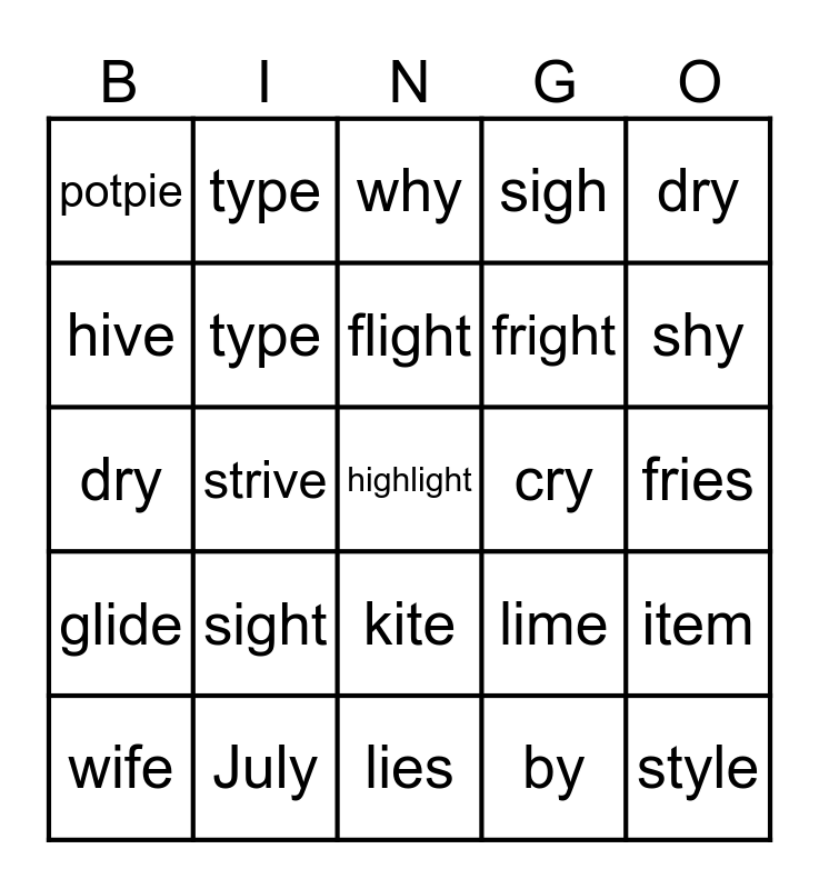 This bingo card has 25 words: sight, lies, flight, wife, dry, potpie, hive, type, cry, kite, fright, dry, lime, item, type, style, fries, why, shy, strive, highlight, July, glide, sigh and by.