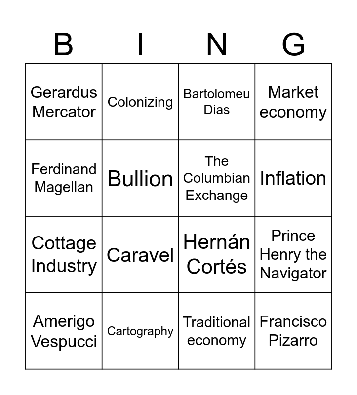 This bingo card has 20 words: Prince Henry the Navigator, Missionaries, Bartolomeu Dias, Christopher Columbus, Amerigo Vespucci, Ferdinand Magellan, Cartography, Gerardus Mercator, Cottage Industry, Colonizing, Caravel, Hernán Cortés, Bullion, Francisco Pizarro, The Columbian Exchange, Mercantilism, Inflation, Market economy, Traditional economy and Gold, God, and Glory.