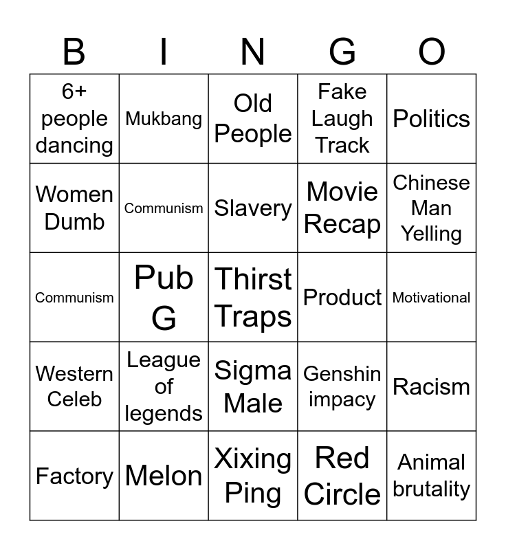This bingo card has a free space and 24 words: League of legends, Melon, Slavery, Factory, Politics, 6+ people dancing, Women Dumb, Mukbang, Product, Sigma Male, Movie Recap, Communism, Genshin impacy, Racism, Communism, Red Circle, Motivational, Old People, Chinese Man Yelling, Pub G, Animal brutality, Western Celeb, Fake Laugh Track and Xixing Ping.