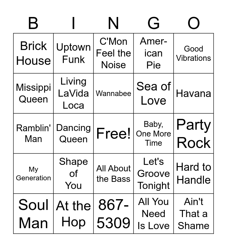 This bingo card has a free space and 44 words: Put Your Head on My Shoulder, Ain't That a Shame, I Walk the Line, Soul Man, Sweet Home AL, All You Need Is Love, C'Mon Feel the Noise, Respect, Good Vibrations, At the Hop, Amer-ican Pie, Baby, One More Time, All About the Bass, Shape of You, 9-5, 867-5309, I'm So Excited, Ramblin' Man, Love Train, Havana, Uptown Funk, Fat Bottomed Girls, Whole Lotta Shakin' Goin' On, Brick House, Roll Over Beetho- vin, Party Rock, Dancin' in the Street, OH, Black Betty, Let's Groove Tonight, My Generation, Blurred Lines, Hard to Handle, Girls Just Wanna, All Shook Up, Dancing Queen, Walk This Way, Can't Stop the Feelin', Conga, Wannabee, Missippi Queen, Sea of Love, Hey Baby, Living LaVida Loca and Me and Bobby McGee.