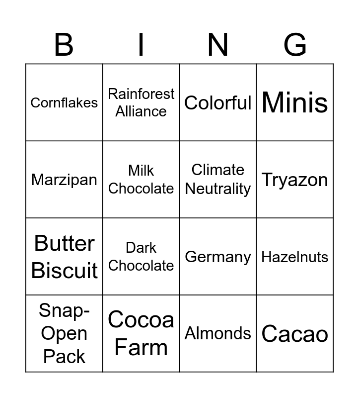 This bingo card has 19 words: Germany, Sustainable, Colorful, Cacao, Hazelnuts, Marzipan, Almonds, Cornflakes, Rainforest Alliance, Butter Biscuit, Dark Chocolate, Milk Chocolate, Climate Neutrality, Cocoa Farm, Snap-Open Pack, Square, Minis, Tryazon and Party.