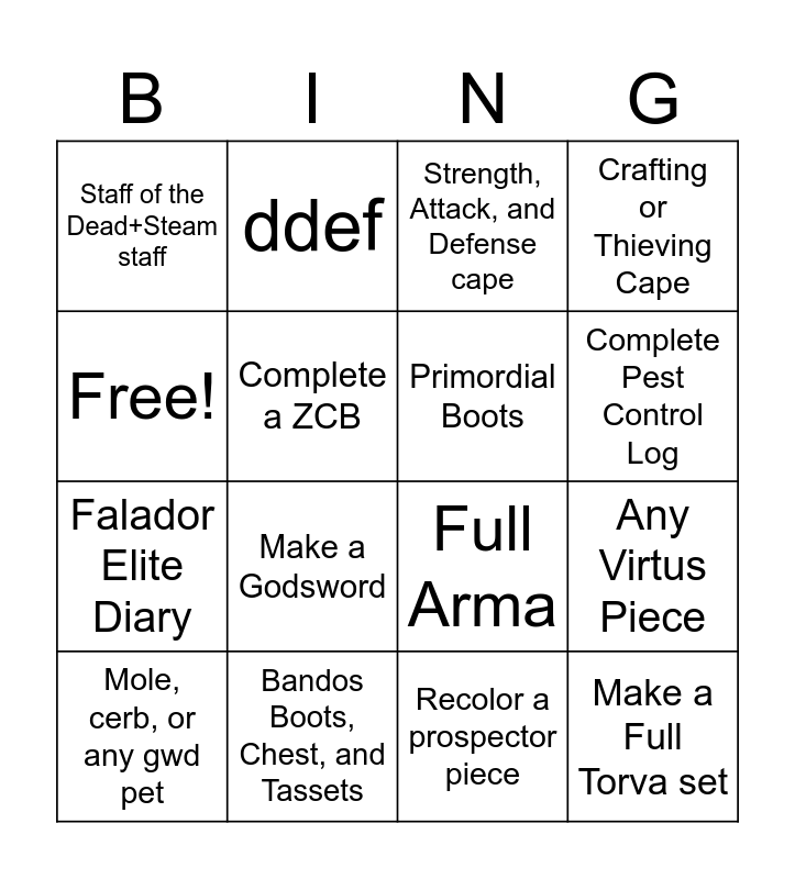 This bingo card has 16 words: Bandos Boots, Chest, and Tassets, Any Virtus Piece, Strength, Attack, and Defense cape, Staff of the Dead+Steam staff, Falador Elite Diary, ddef, Full Arma, Recolor a prospector piece, Free!, Complete a ZCB, Mole, cerb, or any gwd pet, Crafting or Thieving Cape, Make a Godsword, Complete Pest Control Log, Primordial Boots and Make a Full Torva set.
