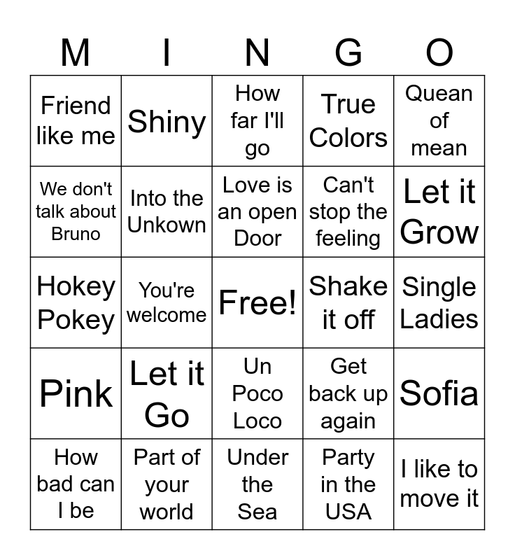 This bingo card has a free space and 24 words: Let it Go, Part of your world, Love is an open Door, How bad can I be, Quean of mean, Friend like me, We don't talk about Bruno, Shiny, Shake it off, Un Poco Loco, Can't stop the feeling, Hokey Pokey, Get back up again, Sofia, Into the Unkown, Party in the USA, Single Ladies, How far I'll go, Let it Grow, You're welcome, I like to move it, Pink, True Colors and Under the Sea.