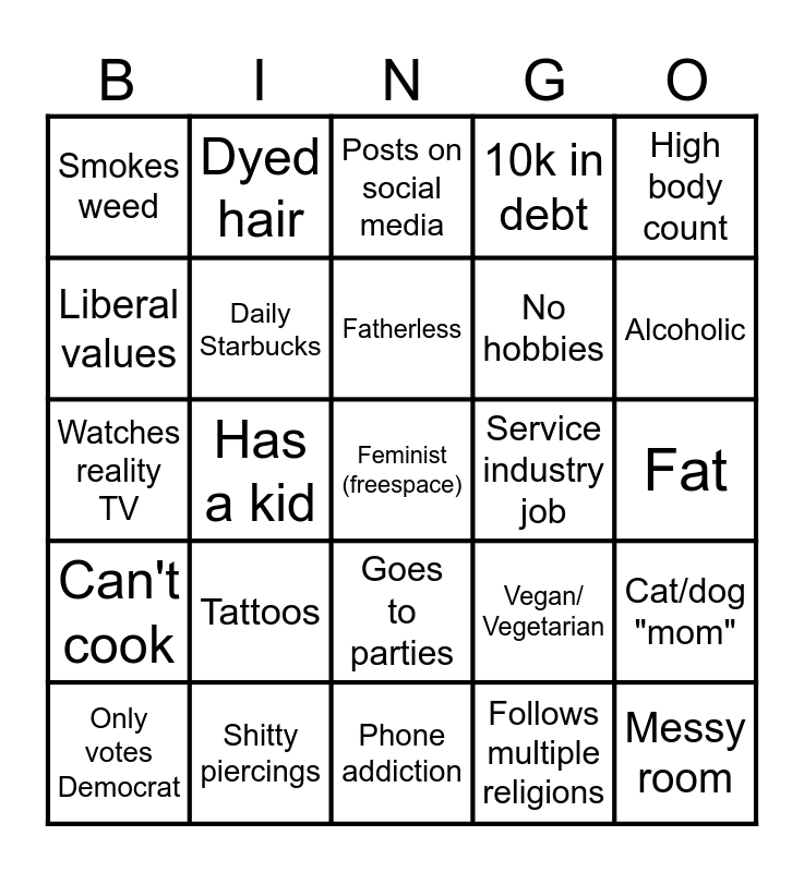 This bingo card has a free space and 24 words: Tattoos, Shitty piercings, Fatherless, Only votes Democrat, High body count, Smokes weed, Liberal values, Dyed hair, Service industry job, Goes to parties, No hobbies, Watches reality TV, Vegan/ Vegetarian, Cat/dog "mom", Daily Starbucks, Follows multiple religions, Fat, Posts on social media, Alcoholic, Has a kid, Messy room, Can't cook, 10k in debt and Phone addiction.