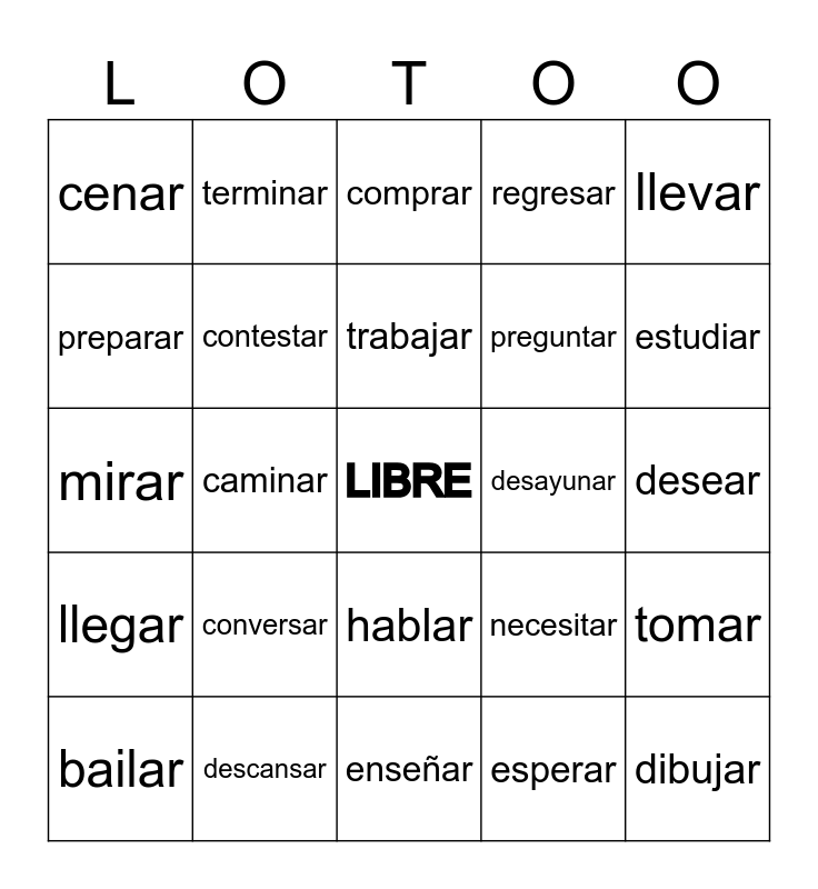 This bingo card has a free space and 29 words: bailar, buscar, caminar, cantar, cenar, comprar, contestar, conversar, desayunar, descansar, desear, dibujar, enseñar, esperar, estudiar, explicar, hablar, llegar, llevar, mirar, necesitar, practicar, preguntar, preparar, regresar, terminar, tomar, trabajar and viajar.