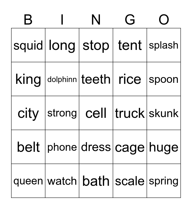 This bingo card has a free space and 24 words: phone, watch, teeth, queen, splash, squid, king, long, truck, dress, rice, city, cage, huge, dolphinn, scale, skunk, stop, spoon, strong, spring, belt, tent and bath.