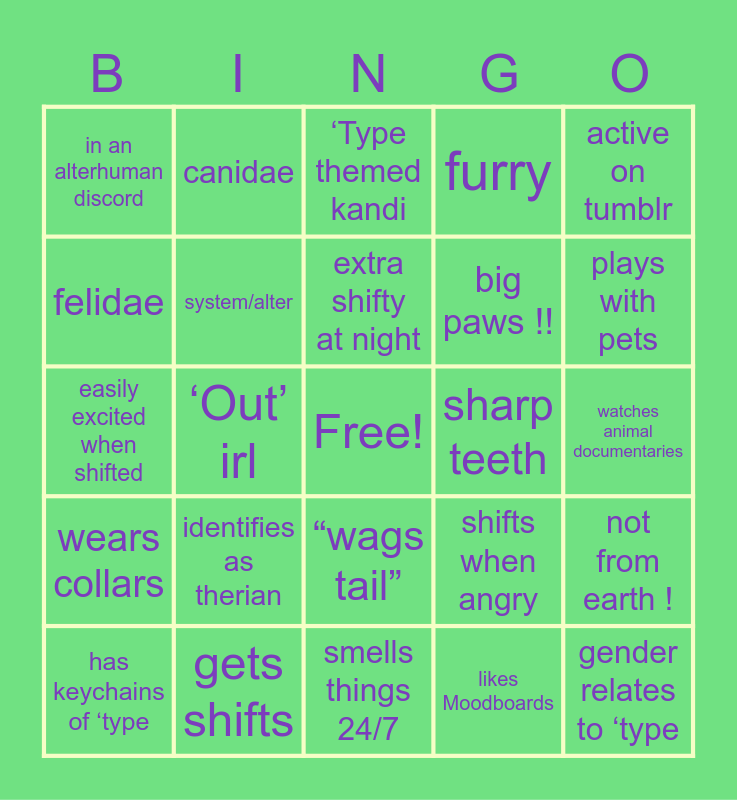 This bingo card has a free space and 24 words: identifies as therian, gets shifts, extra shifty at night, has keychains of ‘type, active on tumblr, in an alterhuman discord, felidae, canidae, sharp teeth, “wags tail”, big paws !!, easily excited when shifted, shifts when angry, not from earth !, system/alter, likes Moodboards, watches animal documentaries, ‘Type themed kandi, plays with pets, ‘Out’ irl, gender relates to ‘type, wears collars, furry and smells things 24/7.