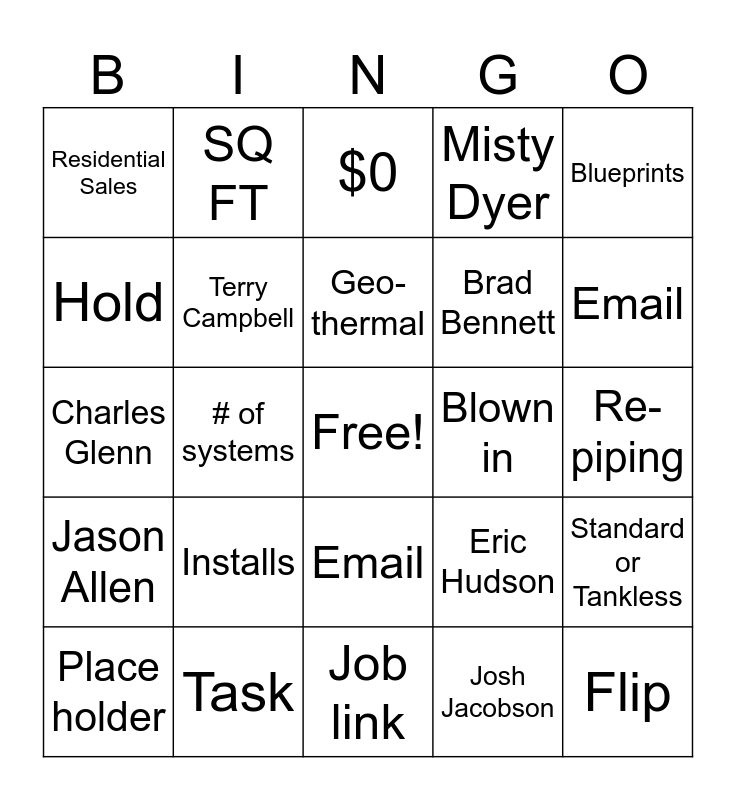 This bingo card has a free space and 25 words: Installs, Job link, Geo-thermal, Place holder, Blueprints, Residential Sales, Hold, SQ FT, Blown in, Email, Brad Bennett, Charles Glenn, Eric Hudson, Standard or Tankless, Terry Campbell, New Mini Split, Re-piping, $0, Email, # of systems, Flip, Task, Jason Allen, Misty Dyer and Josh Jacobson.