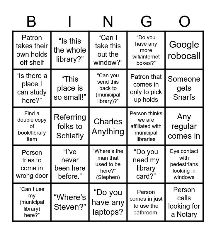 This bingo card has a free space and 53 words: Person calls to ask where we are, Person calls looking for a Notary, Person comes in just to use the printer, Person comes in just to use the bathroom., “I’ve never been here before.”, “Just browsing.”, “Is this the whole library?”, “Is there an upstairs?”, “Is there a place I can study here?”, “Is this a bookstore?”, “This place is so small!”, Explain to a patron this is a mini-branch., Eye contact with pedestrians looking in windows, “Do you need my library card?”, “Can I check this out? No, I don't have a library card.”, “Can I use my (municipal library) here?”, “Can you send this back to (municipal library)?”, Person thinks we are affiliated with municipal libraries, Someone from Wash U calls, Google robocall, Referring folks to Schlafly, Referring folks to Central, Patron that comes in only to pick up holds, Patron takes their own holds off shelf, Person tries to search web on catalog computer, “Where’s Steven?”, “Unfortunately we don't have/can’t do this at this library.”, Hear cars honking a each other, Watch a car speeding on Skinker, Someone gets Snarfs, Someone gets Nami Ramen, Someone Gets Kimchi Guys, Someone Gets Kaldis, Someone gets Starbucks, Person has no identification whatsoever., “Lets ask the PIC”, “Do you have any more wifi/internet boxes?”, “Do you have any laptops?, “Can I take this out the window?”, “Do you have a fax machine?”, Parents letting their kids run loose, “I used to work for the library.”, Any regular comes in, Wash U student comes in, (with three people) “Oh, full house today!”, “Where’s the man that used to be here?” (Stephen), Have to explain we’re a mini-branch, Don’t have certain books customer ask about, Find a double copy of book/library item, Person tries to come in wrong door, Person takes a display book, Person take new fiction book and Person takes a Hot Pick.