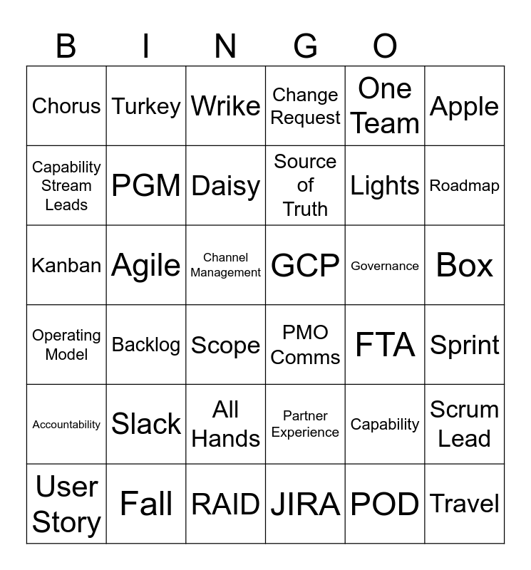 This bingo card has 36 words: Partner Experience, All Hands, JIRA, Capability Stream Leads, Operating Model, GCP, PGM, RAID, One Team, Capability, Roadmap, Change Request, Scrum Lead, Agile, Source of Truth, Chorus, Accountability, Governance, Kanban, Wrike, Channel Management, Backlog, PMO Comms, Scope, FTA, Turkey, Lights, Fall, Daisy, Apple, Travel, User Story, Sprint, Box, Slack and POD.
