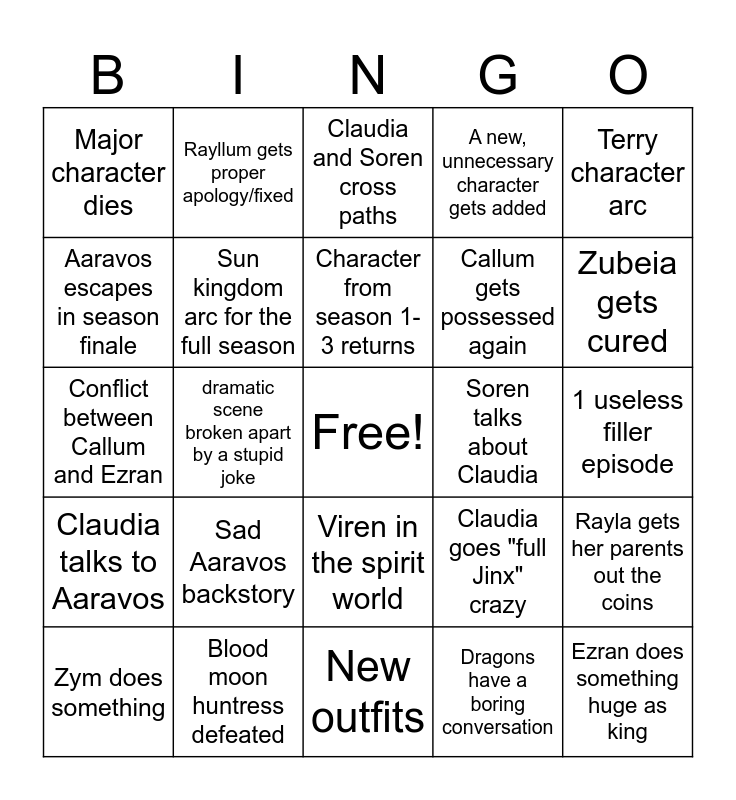 This bingo card has a free space and 24 words: Sad Aaravos backstory, Blood moon huntress defeated, Character from season 1-3 returns, Zym does something, Terry character arc, Major character dies, Aaravos escapes in season finale, Rayllum gets proper apology/fixed, Soren talks about Claudia, Viren in the spirit world, Callum gets possessed again, Conflict between Callum and Ezran, Claudia goes "full Jinx" crazy, Rayla gets her parents out the coins, Sun kingdom arc for the full season, Dragons have a boring conversation, 1 useless filler episode, Claudia and Soren cross paths, Zubeia gets cured, dramatic scene broken apart by a stupid joke, Ezran does something huge as king, Claudia talks to Aaravos, A new, unnecessary character gets added and New outfits.