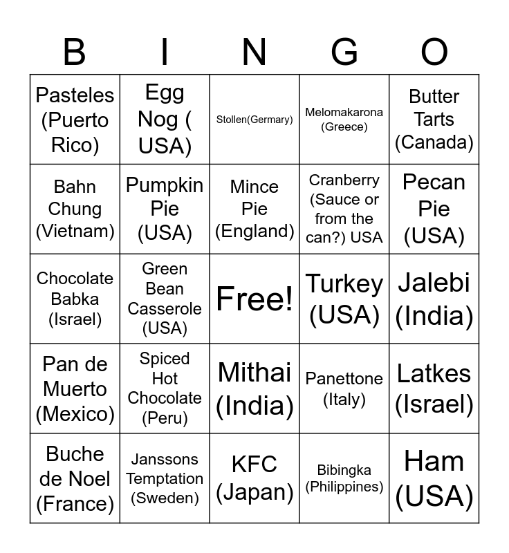 This bingo card has a free space and 24 words: Buche de Noel (France), Spiced Hot Chocolate (Peru), Mince Pie (England), Bibingka (Philippines), Butter Tarts (Canada), Pasteles (Puerto Rico), Egg Nog ( USA), Stollen(Germary), Turkey (USA), Jalebi (India), Chocolate Babka (Israel), Pumpkin Pie (USA), Panettone (Italy), Latkes (Israel), Bahn Chung (Vietnam), Janssons Temptation (Sweden), KFC (Japan), Melomakarona (Greece), Pecan Pie (USA), Pan de Muerto (Mexico), Green Bean Casserole (USA), Mithai (India), Cranberry (Sauce or from the can?) USA and Ham (USA).