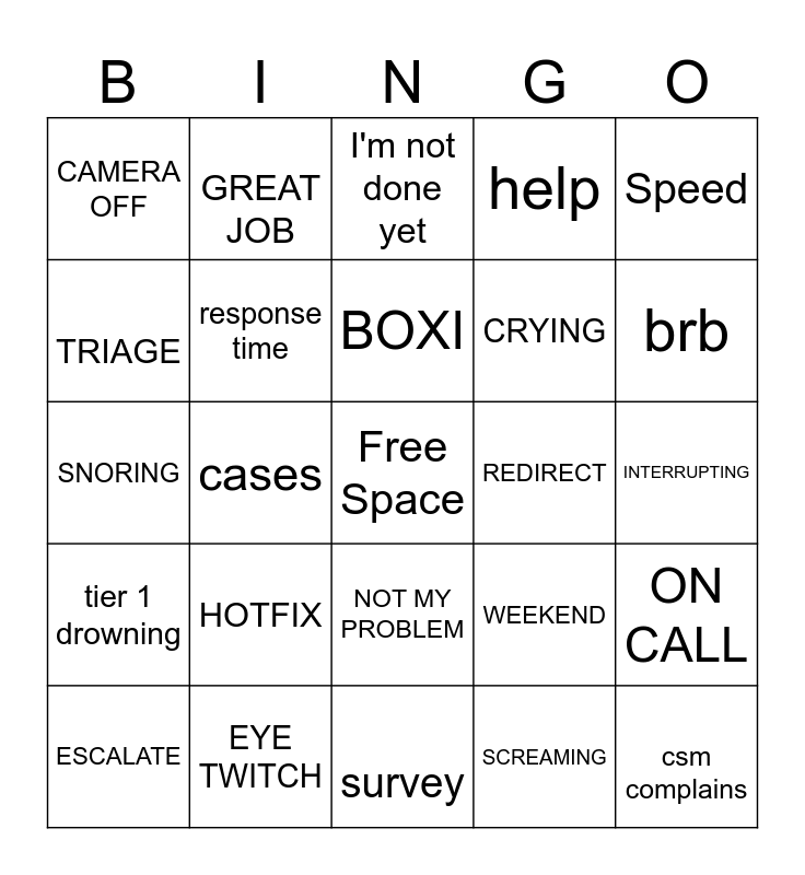This bingo card has a free space and 24 words: HOTFIX, EYE TWITCH, BOXI, ESCALATE, Speed, CAMERA OFF, TRIAGE, GREAT JOB, REDIRECT, NOT MY PROBLEM, CRYING, SNORING, WEEKEND, ON CALL, response time, SCREAMING, INTERRUPTING, I'm not done yet, brb, cases, csm complains, tier 1 drowning, help and survey.