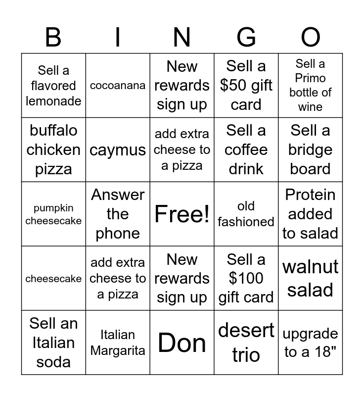 This bingo card has a free space and 26 words: New rewards sign up, desert trio, add extra cheese to a pizza, Italian Margarita, Sell a Primo bottle of wine, Sell a flavored lemonade, buffalo chicken pizza, cocoanana, Protein added to salad, Sell a $100 gift card, Sell a coffee drink, pumpkin cheesecake, walnut salad, Sell an Italian soda, Answer the phone, bruschetta, Sell a $50 gift card, cheesecake, New rewards sign up, upgrade to a 18", Sell a bridge board, Don, old fashioned, add extra cheese to a pizza, caymus and bridge board bundle.