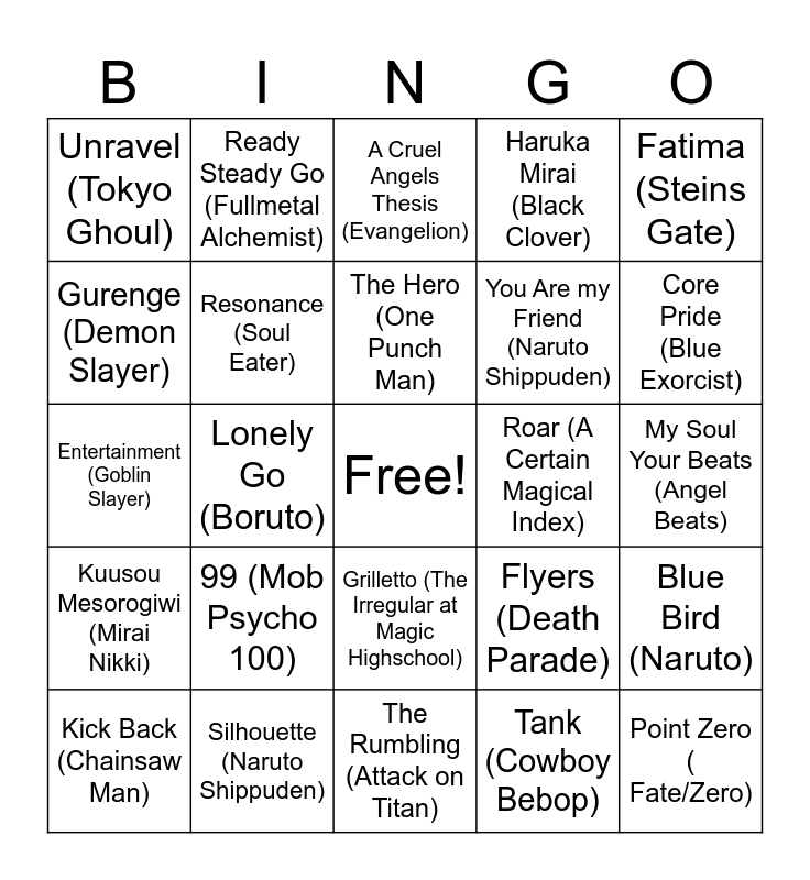 This bingo card has a free space and 55 words: Odd Future (My Hero Academia), Kick Back (Chainsaw Man), Inferno (Fire Force), Unravel (Tokyo Ghoul), The Rumbling (Attack on Titan), My dearest (Guilty Crown), Resonance (Soul Eater), Hope (One Piece), You Are my Friend (Naruto Shippuden), Acceleration (Parasyte), Haruka Mirai (Black Clover), Sengoko Nadeko (Bakemonogatari), This Game (No Game No life), Contradiction (the God of High School), Masayume Chasing (Fairytail), Enamel (Black Butler-Book of Circus), Fatima (Steins Gate), Lonely Go (Boruto), Bye-Bye Yesterday (Assassination Classroom), Point Zero ( Fate/Zero), Roar (A Certain Magical Index), Gekidou (D.Gray-man), Flyers (Death Parade), A Cruel Angels Thesis (Evangelion), History Maker (Yuri!!! on Ice), The Hero (One Punch Man), Tank (Cowboy Bebop), Departure (Hunter x Hunter), My Soul Your Beats (Angel Beats), Blue Bird (Naruto), Blue Bird (Bakuman), Liar Mask (Akame ga Kill), Sakura Kiss (Ouran High School Host Club), Togenkyo Alien (Gintama), Gurenge (Demon Slayer), Entertainment (Goblin Slayer), Colors (Code Geass), Kuusou Mesorogiwi (Mirai Nikki), Ignite (Sword art Online), Good Morning World (Dr Stone), Ready Steady Go (Fullmetal Alchemist), Daddy! Daddy! Do! (Kaguya-sama), Shinzou wo Sasageyo (Attack on Titan), Ado “Kura Kura” (Spy x Family), 99 (Mob Psycho 100), Silhouette (Naruto Shippuden), Pray (Gintama), Koi wa thrill, Shock, Suspense (Detective Conan), Hikaru Naru (Your Lie in April), Core Pride (Blue Exorcist), Ranbu no Melody (Bleach), Gotta Catch ‘em All (Pokemon), To the Light (One Piece), Grilletto (The Irregular at Magic Highschool) and Moonlight Legend (Sailor Moon).