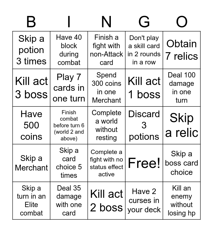 This bingo card has 27 words: Free!, Kill an enemy without losing hp, Kill act 1 boss, Kill act 2 boss, Kill act 3 boss, Finish a fight with non-Attack card, Have 40 block during combat, Skip a Merchant, Discard 3 potions, Skip a boss card choice, Have 500 coins, Don't play a skill card in 2 rounds in a row, Skip a turn in an Elite combat, Deal 35 damage with one card, Deal 100 damage in one turn, Have 5 energy in one turn, Play 7 cards in one turn, Spend 300 coins in one Merchant, Skip a card choice 5 times, Skip a potion 3 times, Skip a relic, Have 2 curses in your deck, Finish combat before turn 6 (world 2 and above), Complete a world without resting, Complete a fight with no status effect active, Obtain 7 relics and Obtain 12 unique cards.