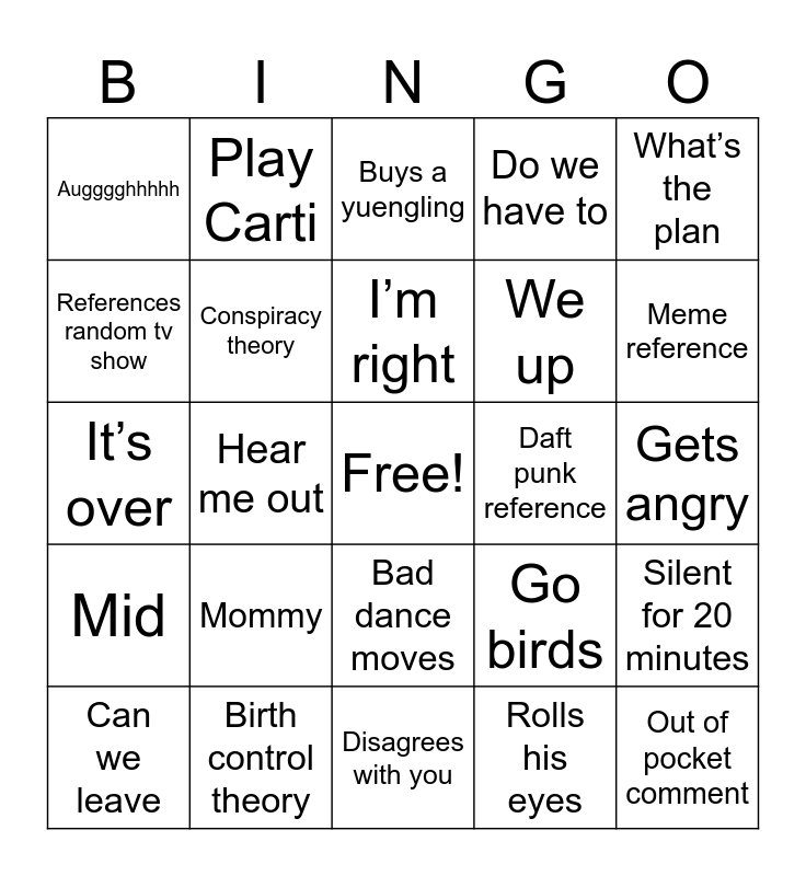 This bingo card has a free space and 24 words: Mommy, Birth control theory, I’m right, Can we leave, What’s the plan, Augggghhhhh, References random tv show, Play Carti, Daft punk reference, Bad dance moves, We up, It’s over, Go birds, Silent for 20 minutes, Conspiracy theory, Rolls his eyes, Gets angry, Buys a yuengling, Meme reference, Hear me out, Out of pocket comment, Mid, Do we have to and Disagrees with you.