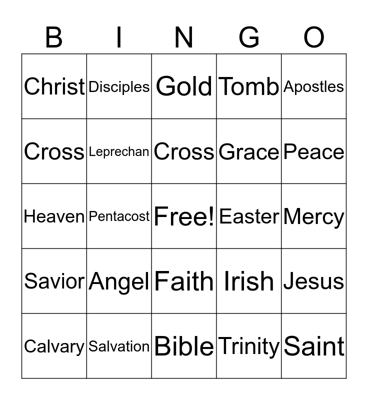 This bingo card has a free space and 25 words: Angel, Bible, Cross, Calvary, Apostles, Christ, Cross, Disciples, Easter, Faith, Grace, Heaven, Irish, Jesus, Leprechan, Luck, Mercy, Gold, Peace, Pentacost, Saint, Salvation, Savior, Tomb and Trinity.
