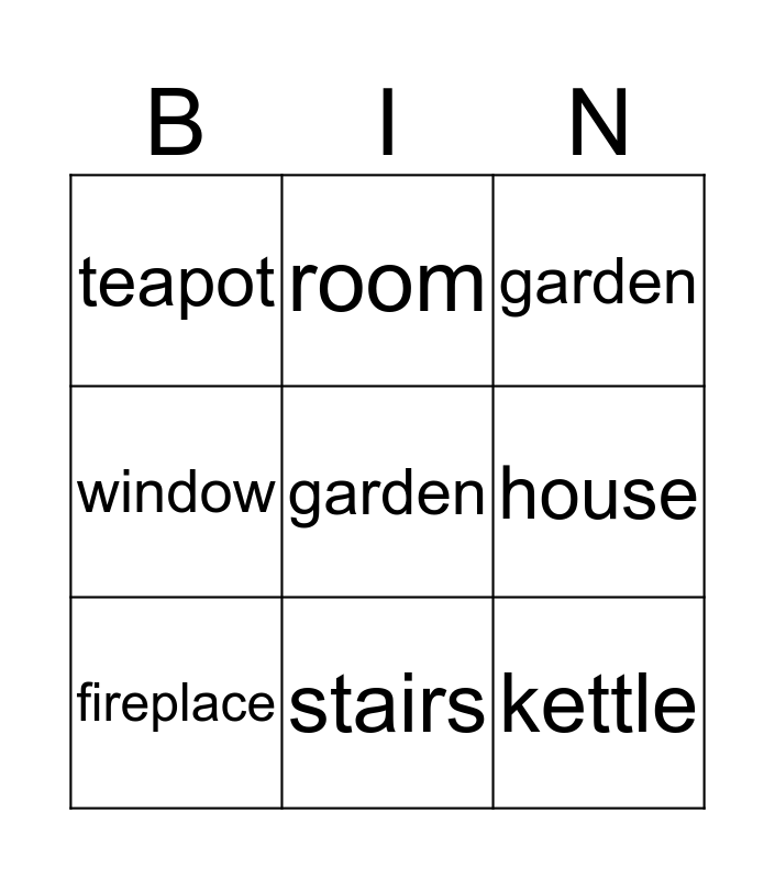 This bingo card has a free space and 8 words: house, garden, room, fireplace, teapot, kettle, window and stairs.