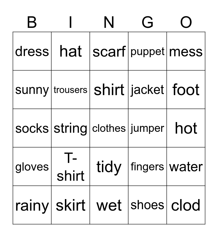 This bingo card has a free space and 24 words: T-shirt, skirt, shirt, rainy, mess, dress, sunny, hat, jumper, tidy, jacket, socks, fingers, water, trousers, shoes, hot, scarf, foot, string, clod, gloves, puppet and wet.