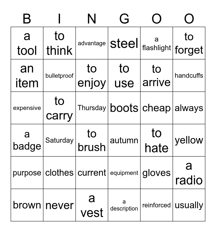 This bingo card has 36 words: equipment, current, a description, an item, a badge, boots, bulletproof, a vest, a flashlight, gloves, handcuffs, steel, a radio, to carry, to use, a tool, purpose, cheap, expensive, advantage, Thursday, Saturday, autumn, to brush, to hate, to think, to arrive, never, to enjoy, to forget, usually, brown, yellow, always, clothes and reinforced.