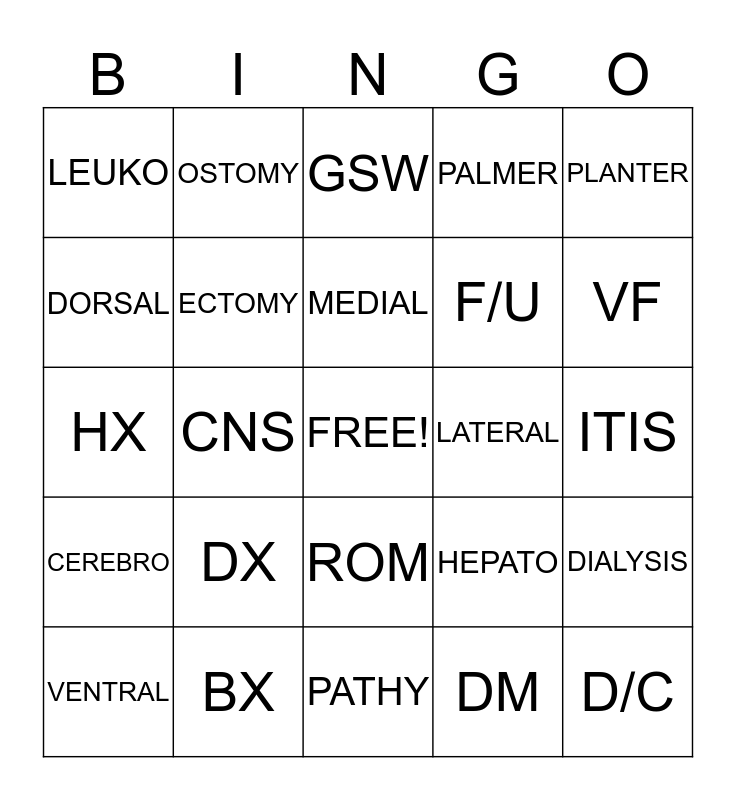 This bingo card has a free space and 73 words: HEMI, HYPER, LEUKO, ANGIO, ARTHRO, CARDIO, CEREBRO, GASTRO, HEPATO, NEPHRO, OSTEO, ALGIA, ECTOMY, ITIS, MEGALY, OSTOMY, PATHY, DORSAL, INTERIOR, LATERAL, MEDIAL, PALMER, PLANTER, PRONE, VENTRAL, SUPERIOR, CARPAL, CERVICAL, LUMBAR, AKA, BX, c, CABG, CHF, CNS, COPD, CRD, CVA, D/C, DJD, DM, DX, ETOH, EMG, FSIQ, F/U, GSW, HBP, HEENT, HX, LBP, LCSW, MSE, OCD, ODD, OU, PVD, ROM, RFC, ROS, SOB, TIA, VA, VF, WNL, ASCITES, BIOPSY, STAT BLIND, DIALYSIS, METASTASES, PARAPLEGIA, PARESIS and TRISOMY.