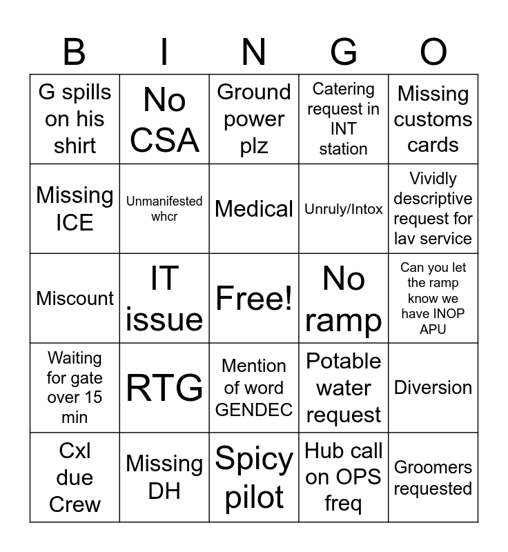 This bingo card has a free space and 24 words: RTG, Missing DH, Medical, Cxl due Crew, Missing customs cards, G spills on his shirt, Missing ICE, No CSA, No ramp, Mention of word GENDEC, Unruly/Intox, Miscount, Potable water request, Diversion, Unmanifested whcr, Hub call on OPS freq, Can you let the ramp know we have INOP APU, Ground power plz, Vividly descriptive request for lav service, IT issue, Groomers requested, Waiting for gate over 15 min, Catering request in INT station and Spicy pilot.
