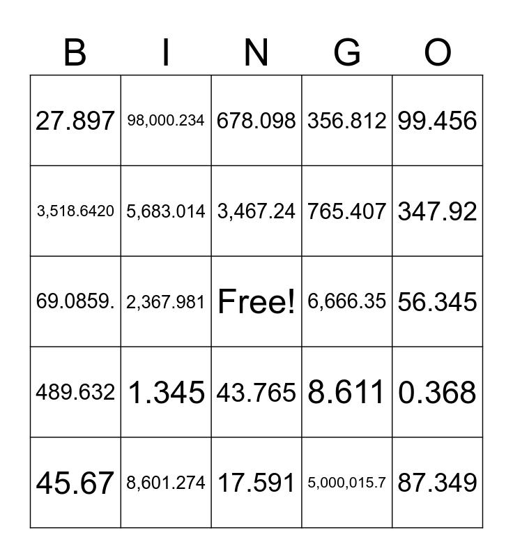 This bingo card has a free space and 24 words: 45.67, 1.345, 3,467.24, 5,000,015.7, 99.456, 27.897, 98,000.234, 678.098, 6,666.35, 56.345, 69.0859., 5,683.014, 8.611, 0.368, 3,518.6420, 8,601.274, 17.591, 356.812, 347.92, 489.632, 2,367.981, 43.765, 765.407 and 87.349.