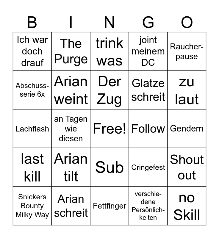 This bingo card has a free space and 24 words: Arian tilt, Arian schreit, Der Zug, Snickers Bounty Milky Way, Raucher- pause, Ich war doch drauf, Abschuss-serie 6x, The Purge, Follow, Sub, Glatze schreit, Lachflash, Cringefest, Shout out, Arian weint, verschie-dene Persönlich-keiten, Gendern, trink was, zu laut, an Tagen wie diesen, no Skill, last kill, joint meinem DC and Fettfinger.