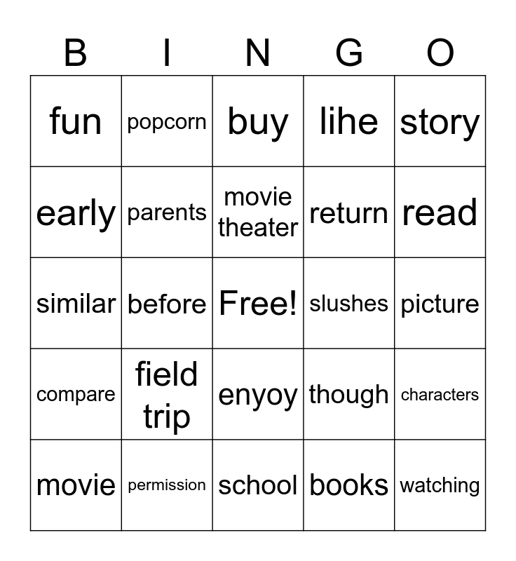This bingo card has a free space and 24 words: field trip, permission, movie theater, movie, story, fun, early, popcorn, slushes, enyoy, return, similar, though, characters, parents, books, picture, buy, read, before, watching, compare, lihe and school.